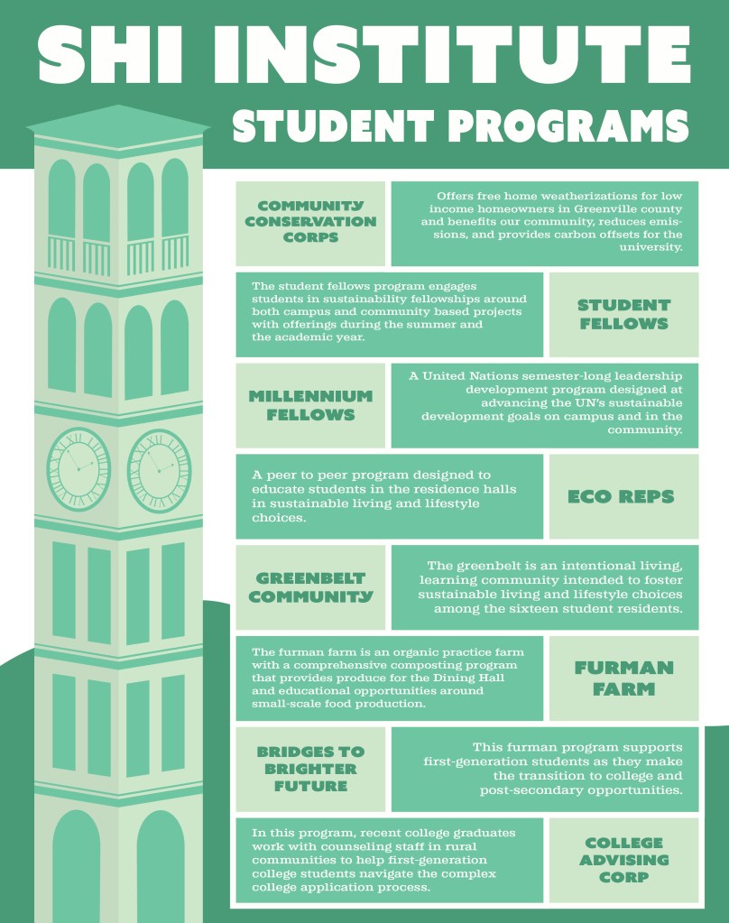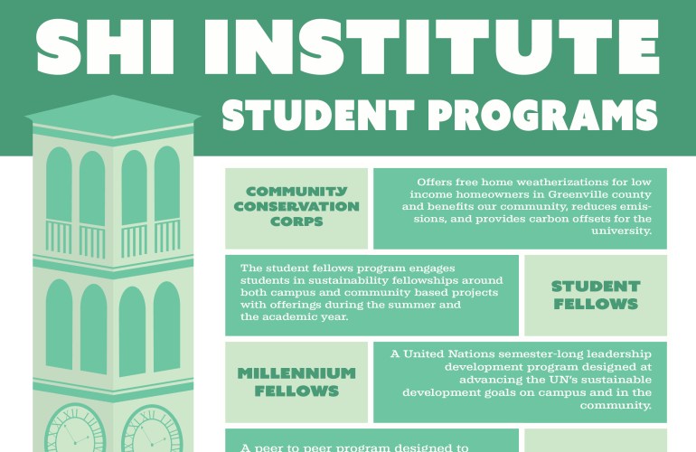 For my Digital Communications class at Furman University, I created a Flyer for Furman’s Shi Institute Student Programs. I used a green color scheme to represent how these are eco-friendly programs and I created the Furman bell-tower to show that the Shi Institute is a Furman program! To read about the role creating this flyer played in my semester, click here!